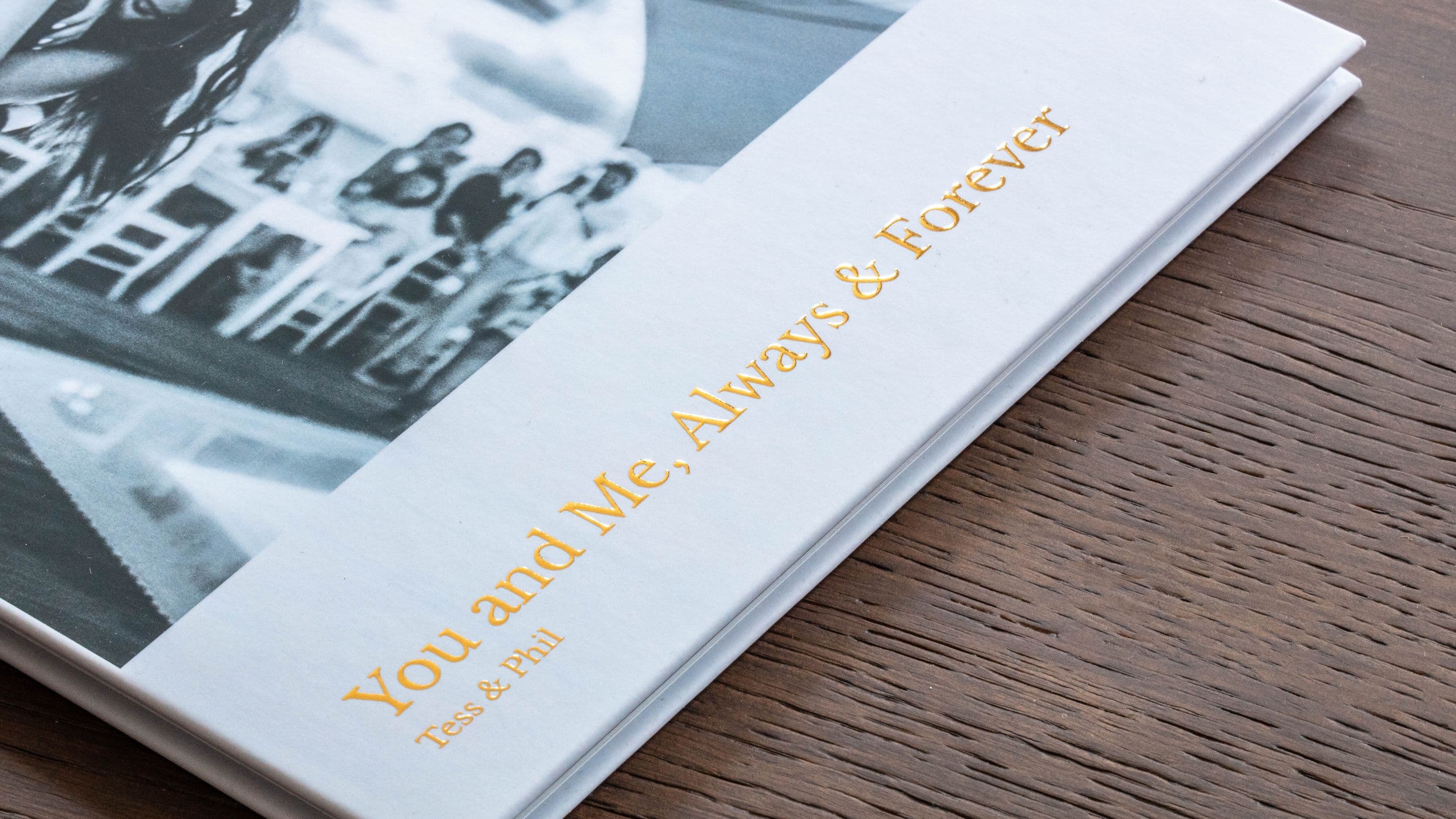 Elevate your wedding album with luxurious foil lettering on the front and spine.
