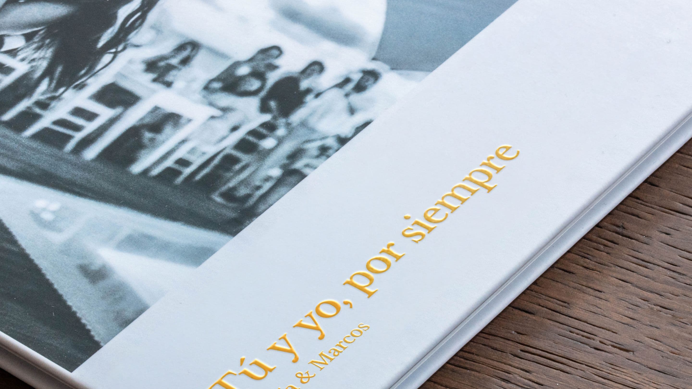 Mejora tu álbum de boda con unas lujosas letras de «foil» en la portada y el lomo.