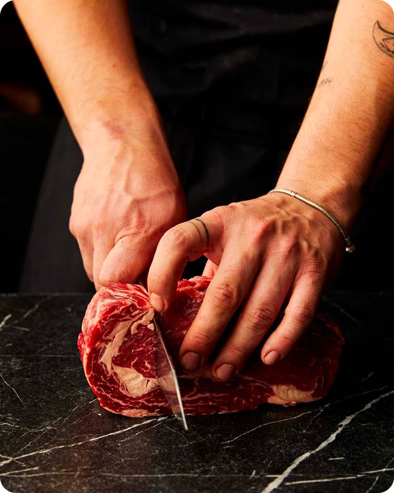 To prepare the ribeye, turn the steak on its side. Position a sharp knife at the eye of the fat and cut straight downwards, stopping at about 5cm from the bottom of the meat.