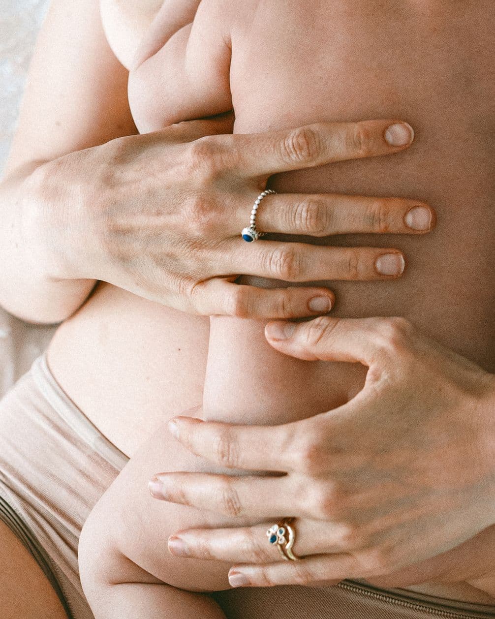 This snapshot takes a very different approach. Here, the colour palette is cooler and more restrained, shifting the emotional focus inwards. Attention is drawn deliberately to the mother’s hands, and the cooler tones help isolate that connection without distraction. Grain is added intentionally to introduce texture, emphasising the feel of human skin and giving the image a subtle, film-like quality. The light is soft and gentle, which suits the intimacy of the moment. I often choose soft lighting for skin-to-skin or quiet interactions, as it supports feelings of calm, closeness and tenderness rather than intensity.