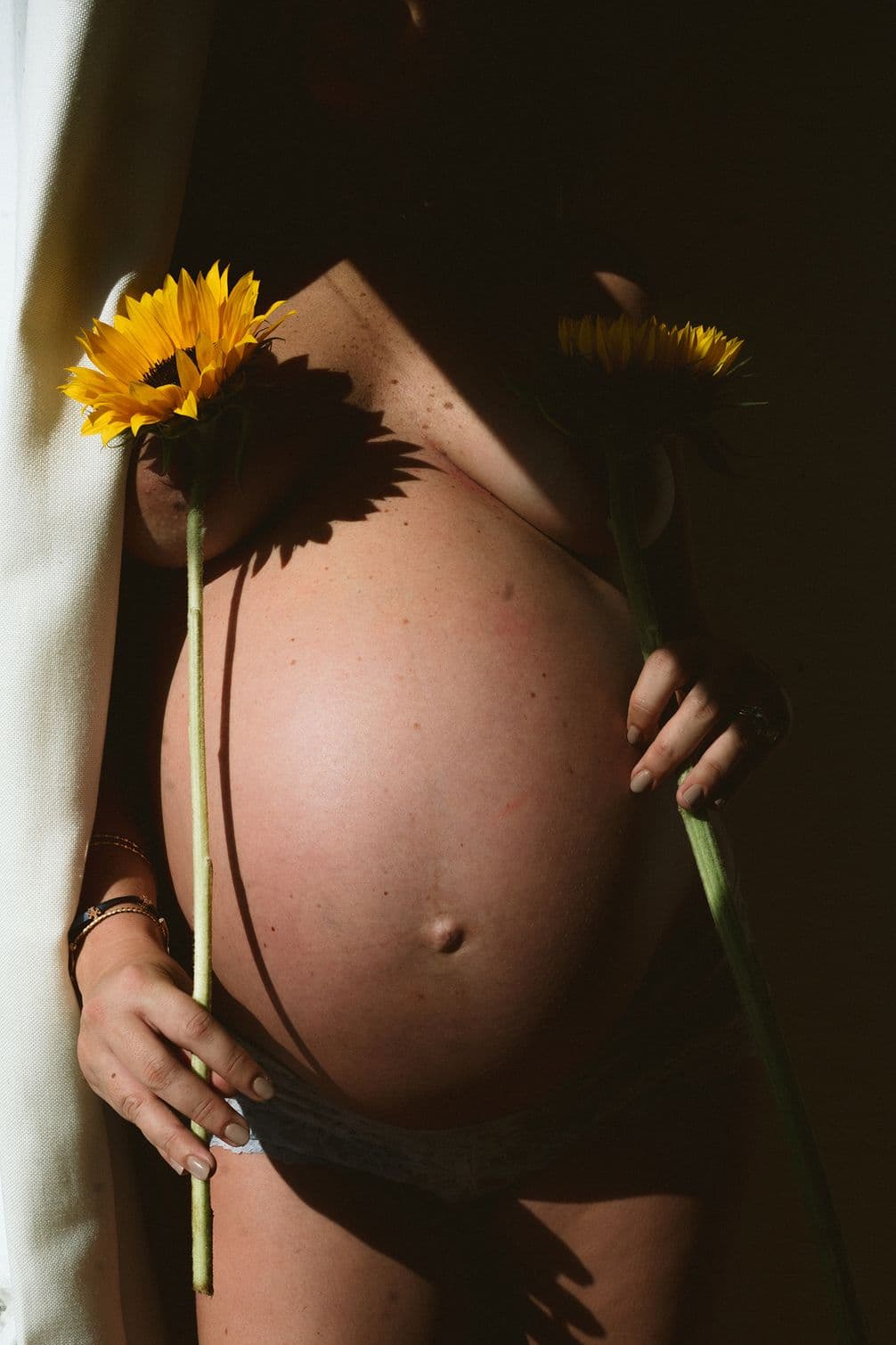 In the image of the pregnant body with flowers, the face is cropped out intentionally so that all attention stays on what matters most, the body itself. By removing identity, the composition directs the viewer towards the emotional core of the image rather than the individual. By cropping out the face, controlling light and choosing symbolic elements carefully – sunflowers, in this instance – the frame itself becomes the emotional narrator. When identity is removed, thoughtful composition helps the viewer understand what to feel and where to look without needing a face to explain the moment.