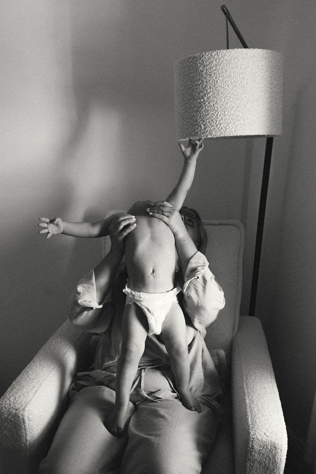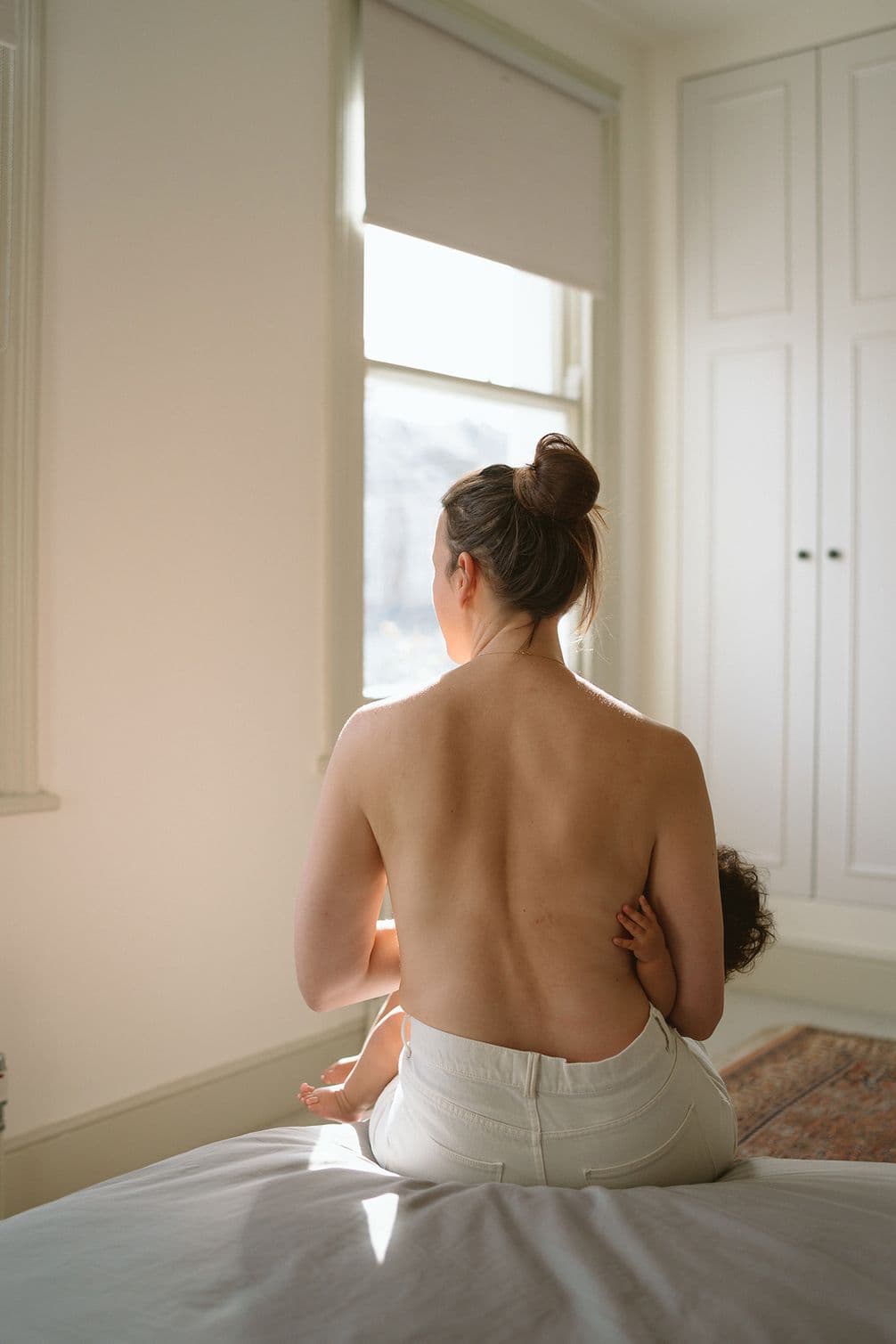Mum’s seated position feels protective and grounded, while the way her head turns slightly away, towards the window and the light, suggests a quiet pause. The emotion here reads as a calm, peaceful and intimate moment.