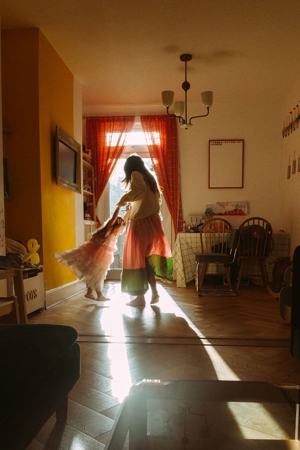 In this image, mood is driven by a combination of strong light, warm colour and tactile materials. The bright sunlight creates a sense of warmth and positivity, instantly suggesting joy, energy and ease. Translucent fabrics, curtains, skirts and dresses allow light to pass through, softening the scene while keeping it dynamic. This interaction between light and texture makes the image feel airy and alive. The warm colour palette, with yellow tones in the walls and overall warmth throughout the frame, reinforces feelings of nostalgia, happiness and the carefree nature of spring or summer. Everything in the image works together to support a sense of play and shared joy.