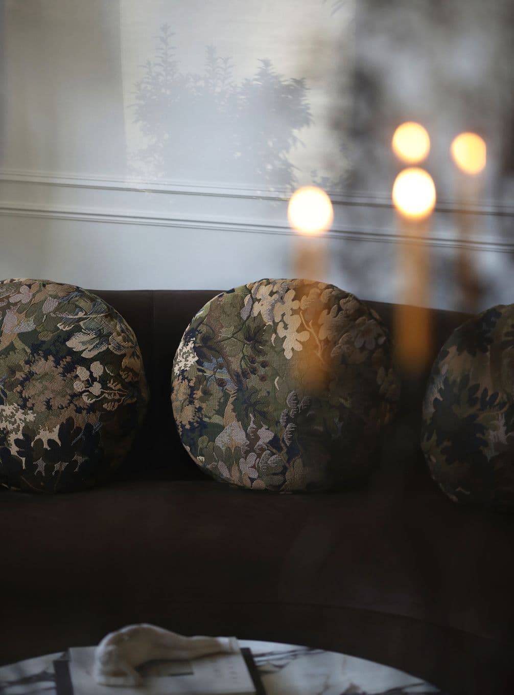 As daylight shortens, the atmosphere becomes the new luxury. Begin with warm, ambient lighting such as dimmable sconces, table lamps and candlelight. At No.17 House, antique brass dimmers and soft-glow layered lighting allow spaces to shift from bright mornings to enveloping evenings. Aim for layers of light rather than a single overhead source and allow some shadow to remain, darkness adds atmosphere. Build texture thoughtfully, a sheepskin draped over a chair, a wool throw on a linen sofa, or ceramics grouped in threes bring subtle warmth. Our Haven Sheepskin Pouffe from our Six The Residence collaboration adds both tactility and sculptural shape, balancing beauty and practicality.