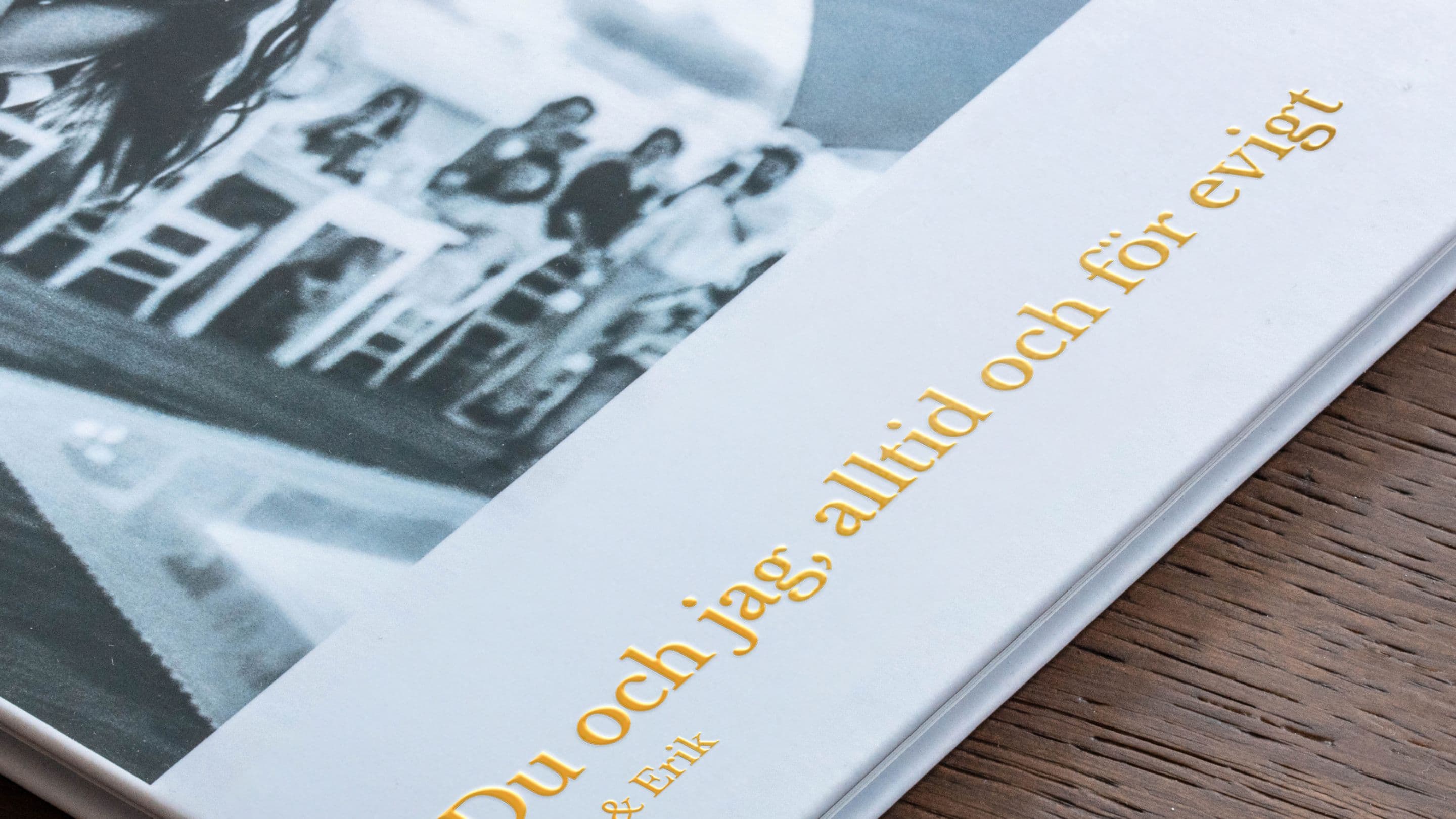 Lyft ditt bröllopsalbum med lyxiga foliebokstäver på framsidan och ryggen.